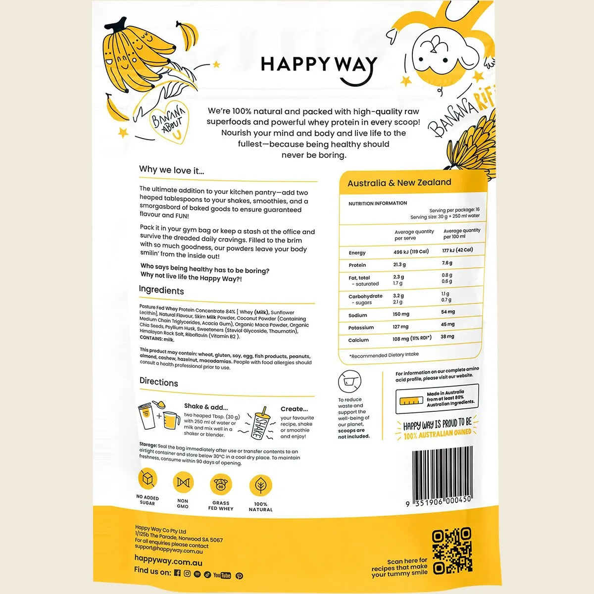 Happy Way Banana Bonanza Whey Protein Powder gives you a clean, nourishing and delicious banana-flavoured protein shake to help fuel your day, recover faster and enjoy a great-tasting boost anytime.