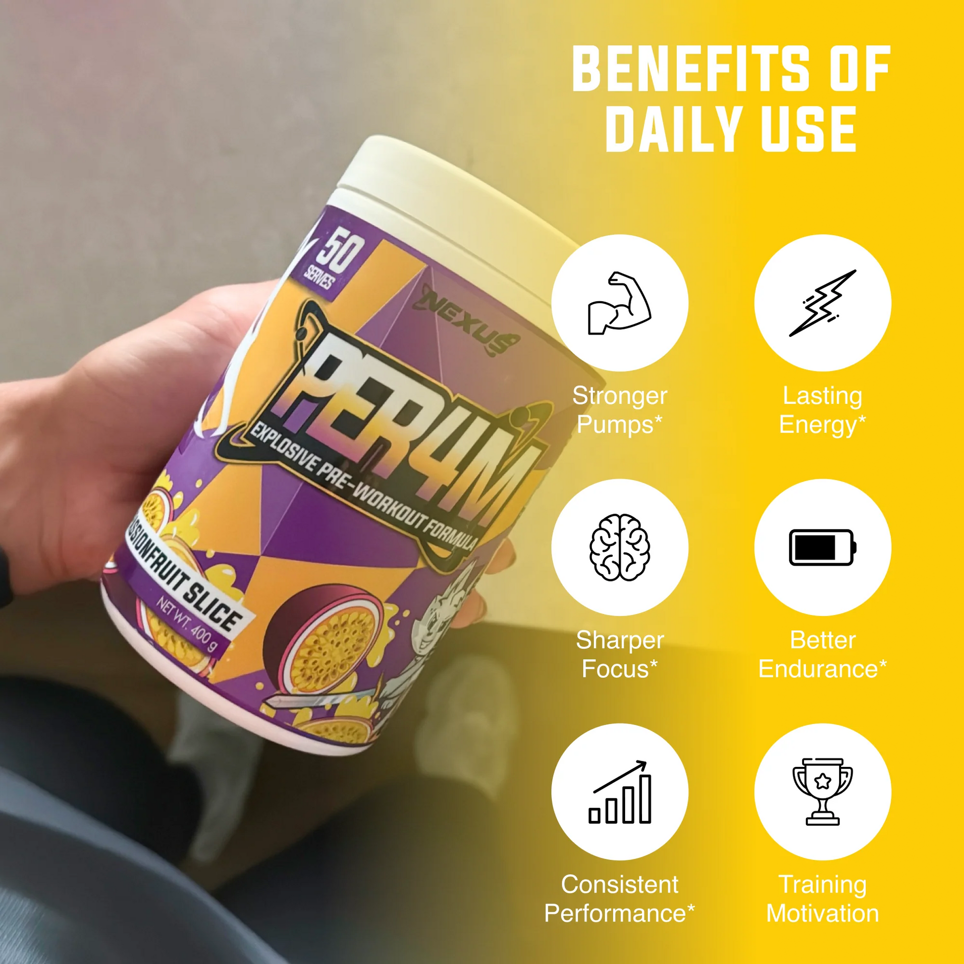 This is a 400g (50 serves) of Nexus PER4M Pre-Workout Passionfruit Slice flavour. Take your training to the next level with PER4M Pre-Workout by Nexus Nutrition. This high-stim, performance-driven formula combines 17 premium ingredients to deliver explosive energy, laser-sharp focus and powerful muscle pumps.