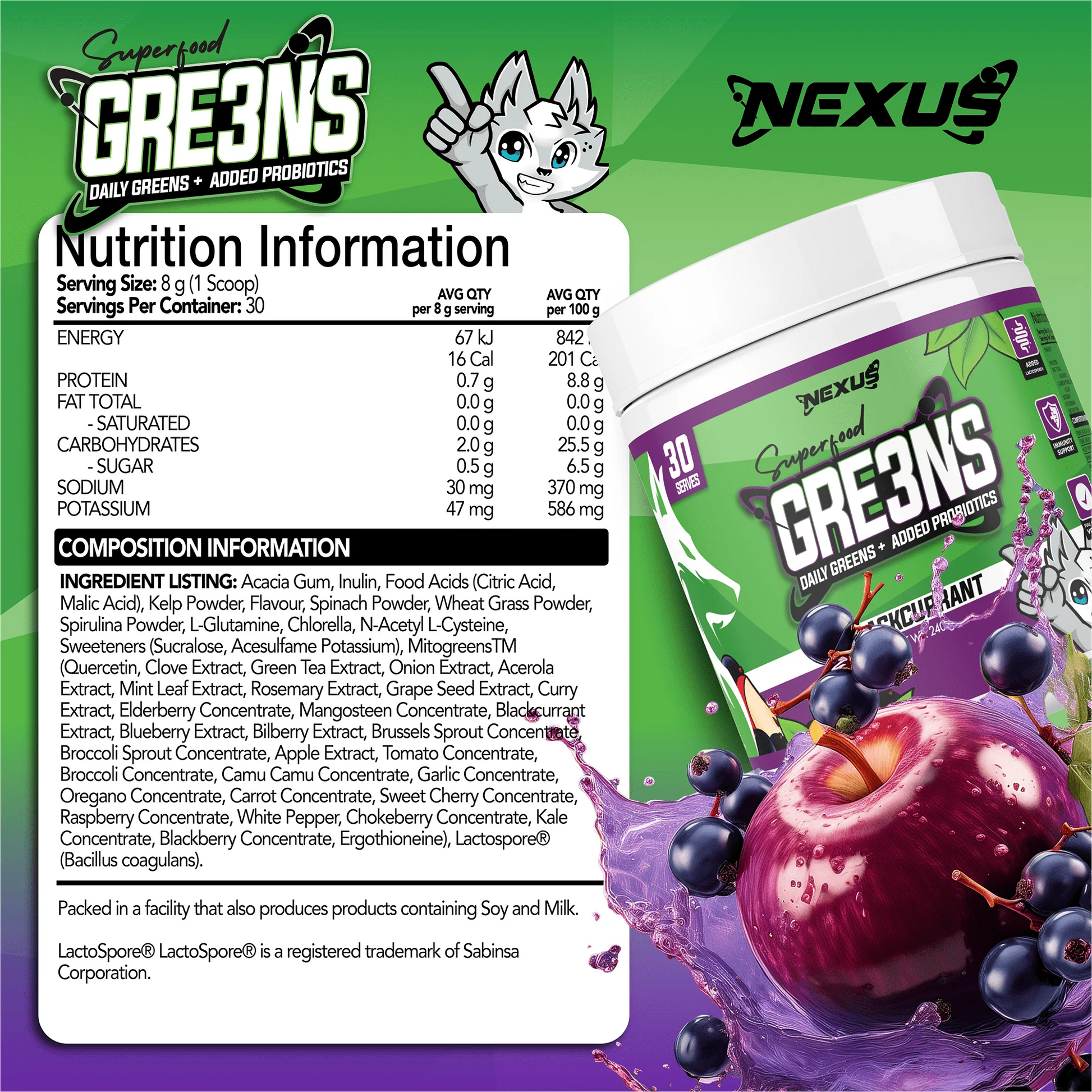 This is a 240g (30 serves) of Nexus Superfood Greens Blackcurrant. Fuel your daily wellness with our premium Superfood Greens, a powerhouse blend of organic greens, gentle fibre and probiotic support. Designed to support digestion, immunity and overall balance, this refreshing formula brings plant-based nutrition into a delicious, easy-to-enjoy scoop.
