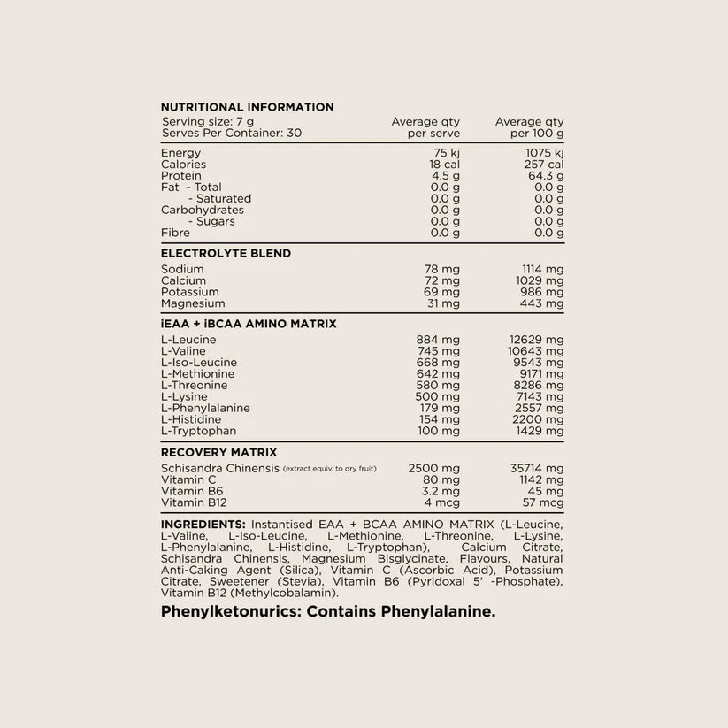 Essential amino acids, electrolytes, B vitamins, adaptogen blend, natural flavours and sweeteners. See product label for full details.