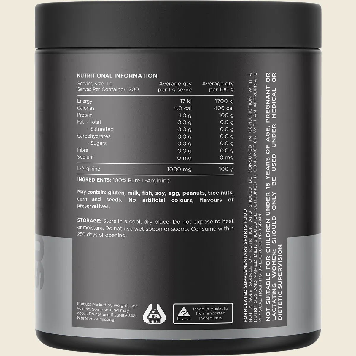 100 percent pure L-Arginine. Refer to label for serving details.