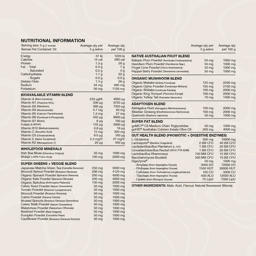 Super greens and veggie blend including spinach, kale, broccoli sprout, spirulina and beetroot; native Australian fruit blend including kakadu plum, davidson plum, finger-lime and pepperberry; whole-food minerals sea moss and shilajit; adaptogen and mushroom blend; gut health blend with probiotics, digestive enzymes and L-glutamine. No added sugars or cheap fillers. Manufactured in a facility that processes wheat, tree nuts, seeds, dairy, soy, corn and fish; always refer to label for allergens.