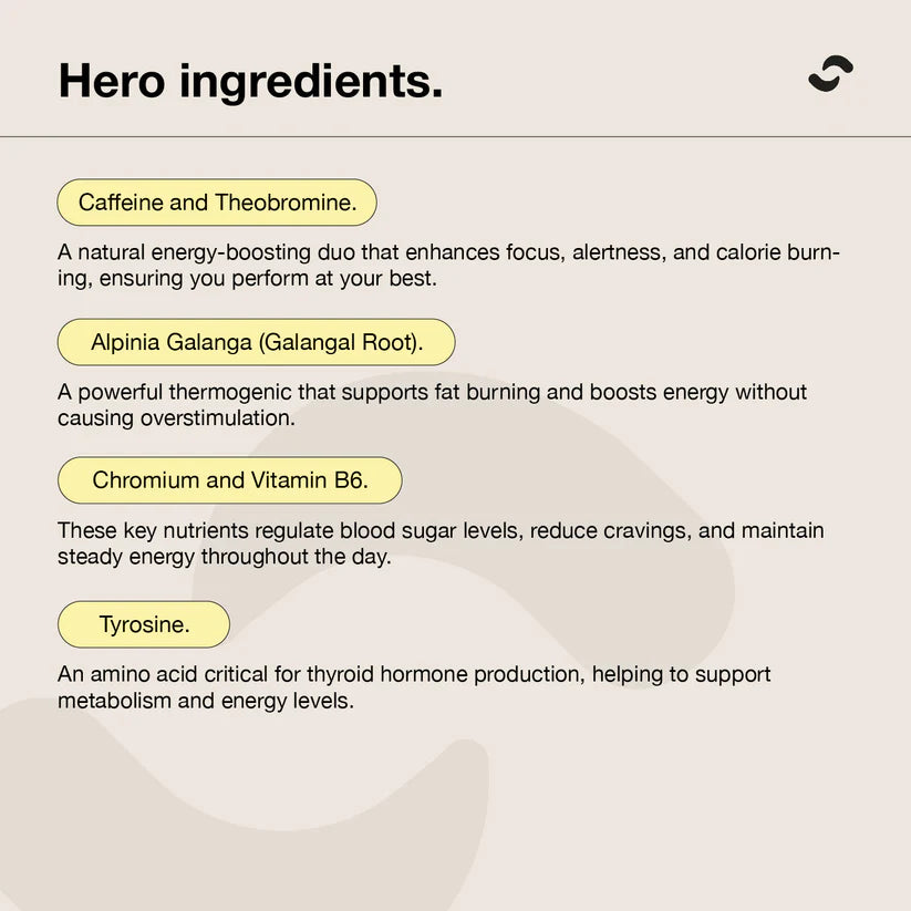 Caffeine, acetyl-L-carnitine, tyrosine, theobromine, botanical extracts, vitamins and natural flavours. See product label for full ingredient details.