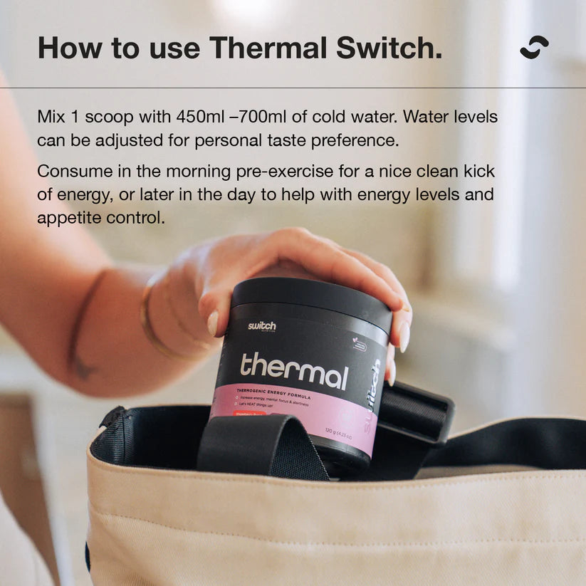 This is a Strawberry Burst 120g (30 Serves) of Switch Nutrition Thermal Powder. Thermal is a premium thermogenic fat burner designed to support increased energy, metabolism and fat-burning performance. Formulated with natural caffeine, acetyl-L-carnitine, tyrosine and botanical extracts, it helps boost calorie burn, sharpen focus and assist appetite control while supporting clean, long-lasting energy.