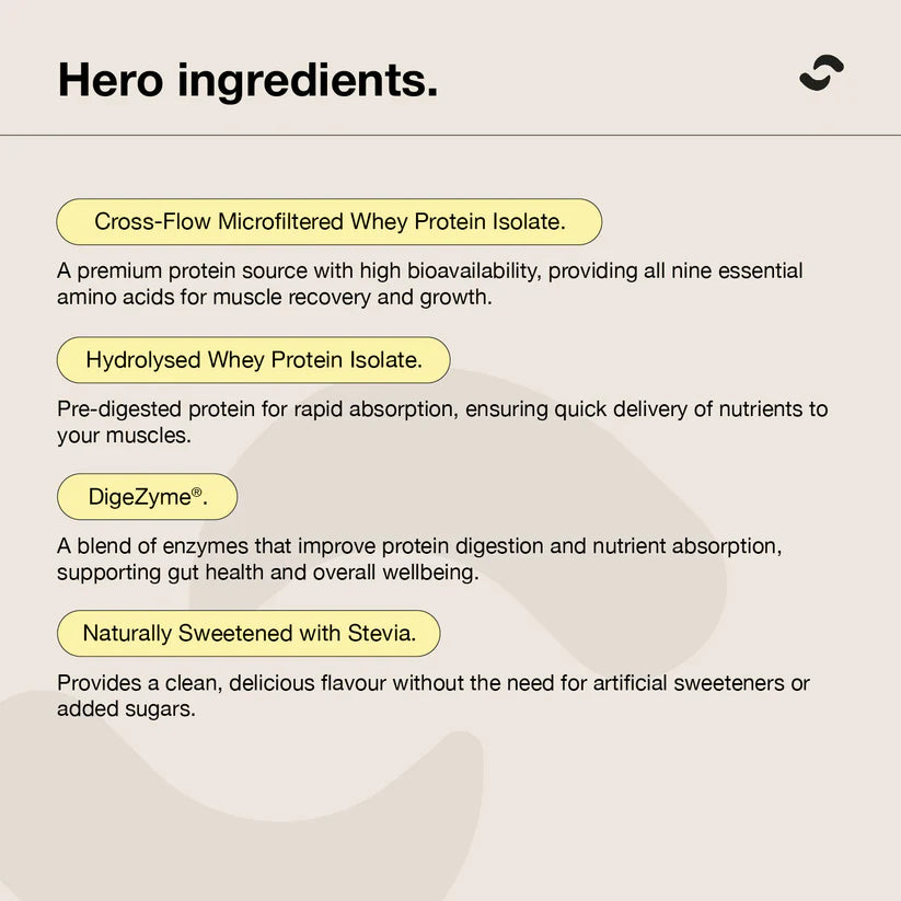 This high quality formula uses micro-filtered whey protein isolate and hydrolysed whey isolate for rapid absorption and superior muscle repair. It mixes smoothly, tastes great and includes digestive enzymes to support easy digestion, making it suitable for those who struggle with regular whey protein powders.