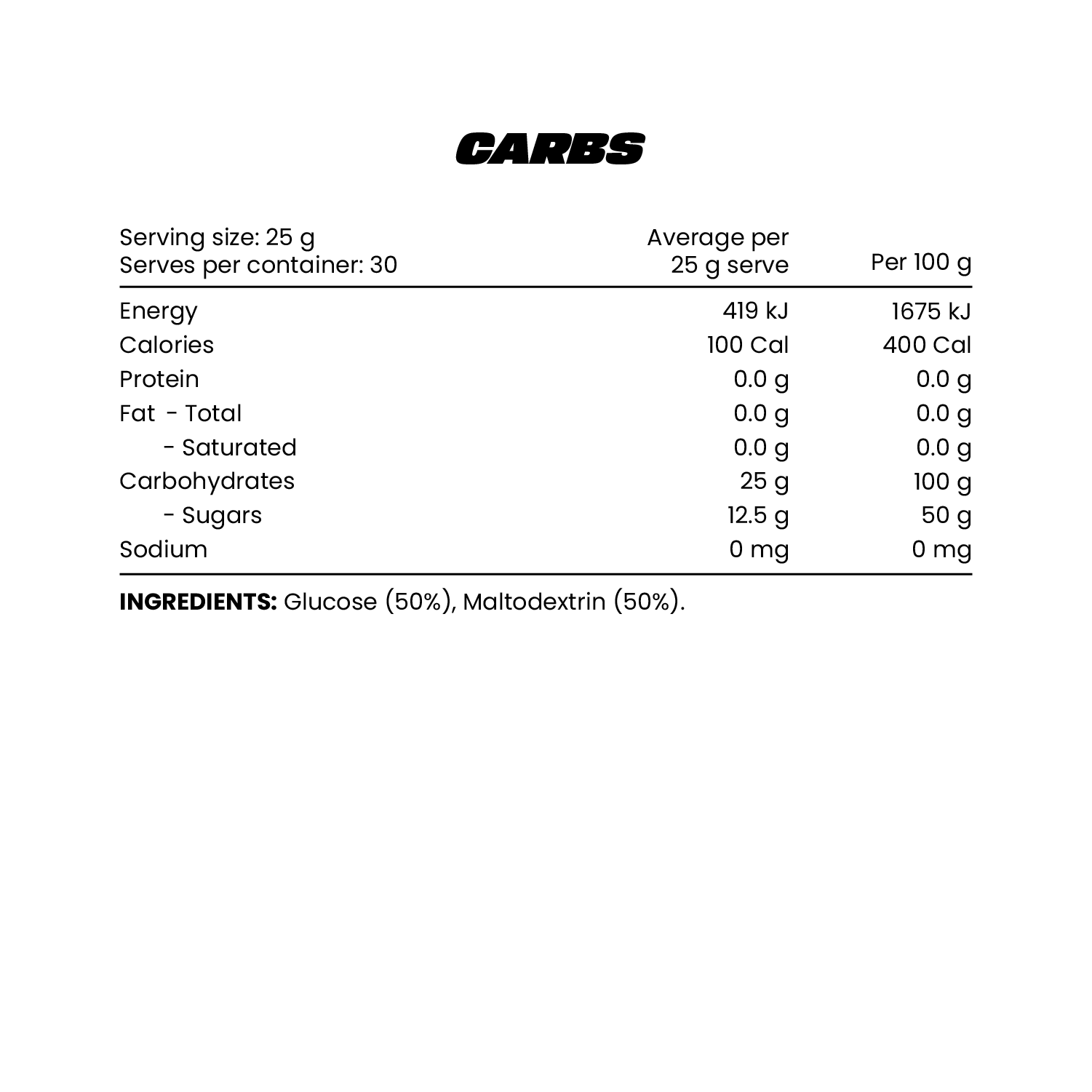 This is a 750g (30 Serves) of Zombie Labs CARBS Pure Carbohydrates. This formula provides 100% pure carbohydrate power in a clean, unflavoured blend of glucose and maltodextrin, made for athletes, heavy trainers and anyone chasing increased energy and muscle support.