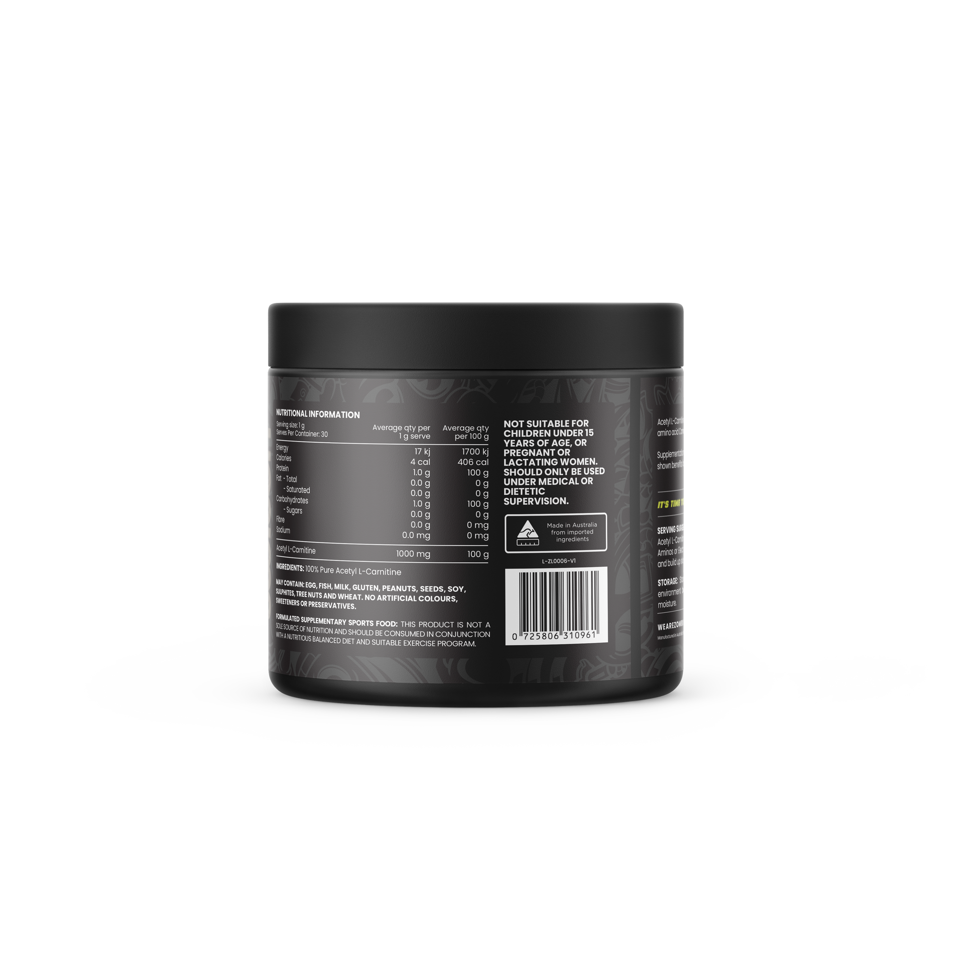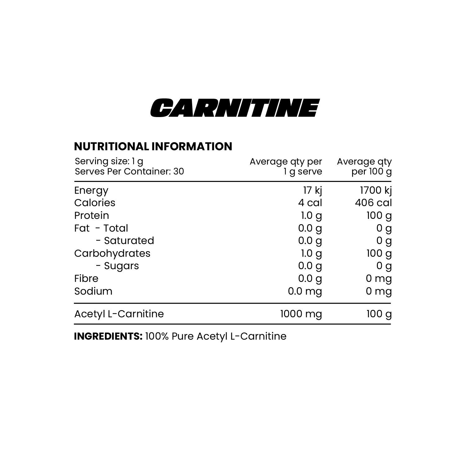 This is a 30g (30 Serves) of Carnitine by Zombie Labs. Carnitine supports fat metabolism, energy production and mental focus. This pure Acetyl L-Carnitine powder is designed to assist the transport of fatty acids for use as fuel, making it ideal for training performance and body composition goals.