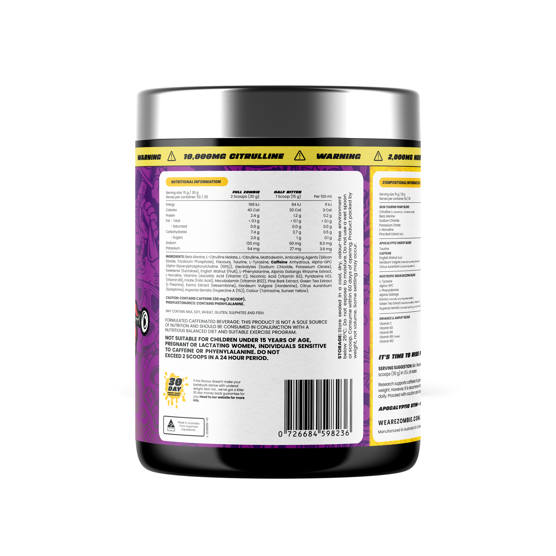 This is 750g (50 Serves) Toxic Tropic Flavour Zombie Labs End Of Dayz Apocalyptic Pre Workout. This advanced high stimulant formula is built for experienced lifters who want extreme intensity, maximum endurance and powerful muscle activation during heavy strength or high volume sessions.