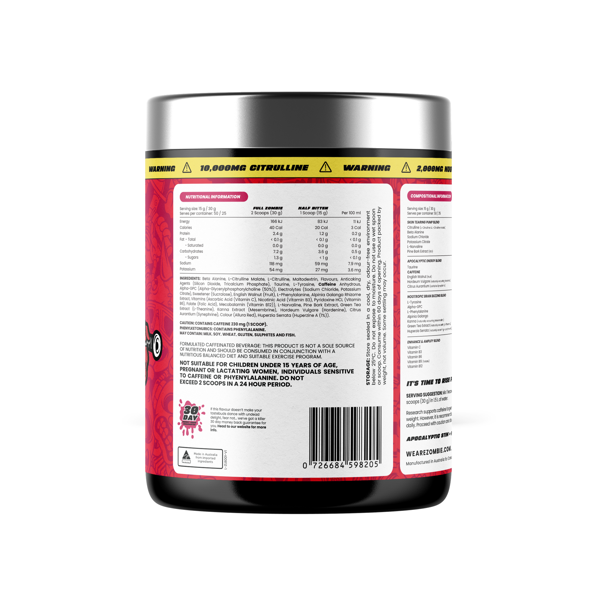 This is 750g (50 Serves) Ruthless Raspberry Sour Flavour Zombie Labs End Of Dayz Apocalyptic Pre Workout. This advanced high stimulant formula is built for experienced lifters who want extreme intensity, maximum endurance and powerful muscle activation during heavy strength or high volume sessions.